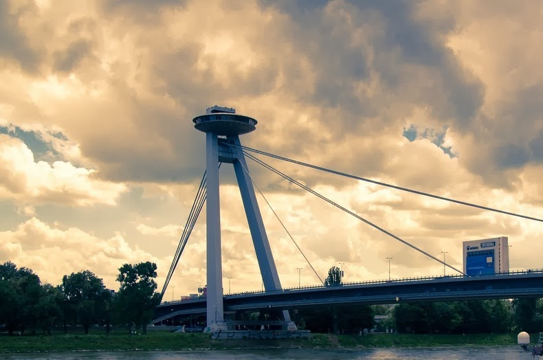 The Bridge of the Slovak National Uprising, commonly known as Most Slovenského národného povstania or Most SNP in short, is a road bridge over the Danube river in Bratislava, the capital city of Slovakia. The bridge was built in late 1960s and early '70s at the height of Communist excess, in honor of the 1944 resistance movement against the Nazi forces. The very retro-futuristic SNP Bridge was inspired by the optimistic futurism of the 1960s, evident from the flying saucer-shaped structure at the top of the bridge’s only pylon. The UFO structure actually houses a restaurant reached using an elevator and offers a beautiful panoramic view of Bratislava.